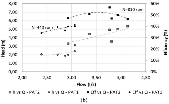 Characteristic curves: (a) single PAT for different rotational speeds; (b) PATs in parallel for 440 and 810 rpm in each PAT.