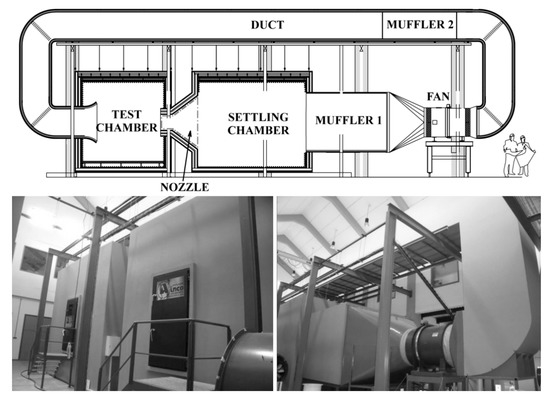 The wind tunnel to be employed for the characterization of the model is a closed-loop, open jet wind tunnel, comprising a test chamber 4.2 m long with a cross-sectional area of 4.45 × 2.80 m2 (width × height). The nozzle discharge section is 1.15 × 1 m2. The scheme of the wind tunnel is shown in Figure 1. Following the recommendations for wind tunnel blockage values from NASA [2], the maximum dimensions of the prototype to reduce blockage were calculated to be 0.8 m × 0.6 m (width × height). Thus, the diameter of the small-scale rotor was chosen to be D = 0.8 m and the blade span was chosen as H = 0.6 m, the maximum possible size to capture as much energy from the wind as possible. The wind tunnel is also suited to perform acoustic measurements.