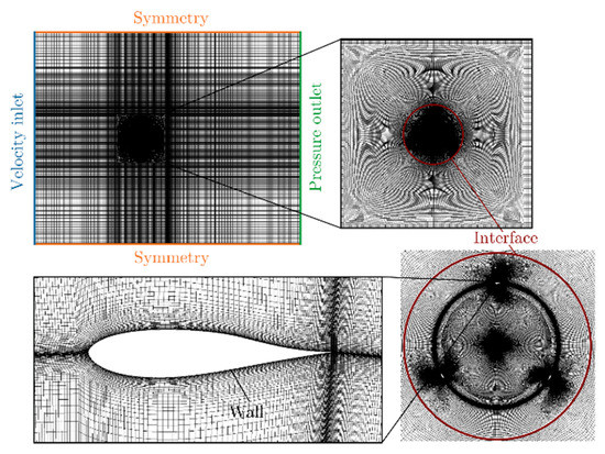 The Navier-Stokes equations that describe the fluid dynamics were solved with ANSYS FLUENT®, using the k-ω-SST model for the turbulence closure. A velocity-inlet condition of 10 m/s was imposed at the domain inlet, and a pressure-outlet condition equal to atmospheric pressure was applied at the domain exit. Symmetry conditions have been applied to the lateral limits of the domain, and the wall boundary condition has been applied to the blades. Finally, an interface zone separates the rotor moving zone from the rest of the domain.