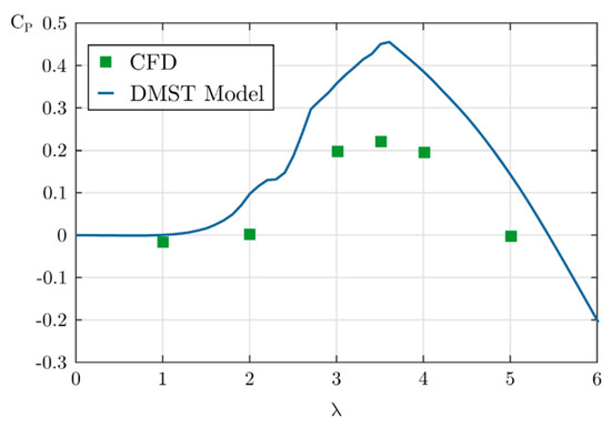 Figure 3 shows the power curve of the proposed design, predicted by both the streamtube model and the CFD simulations. Both predict the maximum performance of the turbine at the same tip speed ratio value of 3.5 (this is the relationship between the rotational velocity of the blades and the incoming wind velocity). However, there are some differences between the values of the expected power coefficients. These may be attributed to the effect of the wakes shed on the upwind part of the turbine on the downwind blades as well as to the assumptions performed by the streamtube model about the flow behavior. These aspects are to be confirmed after the experimental characterization of the model.