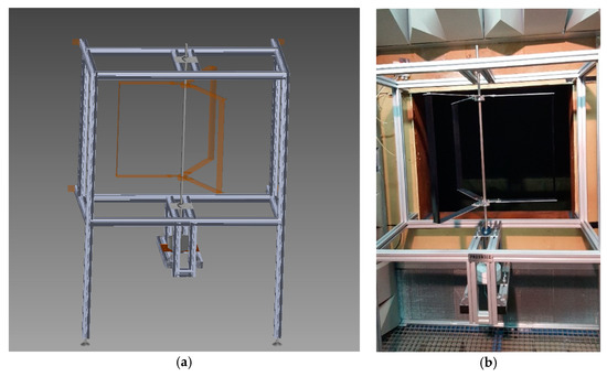 Final prototype design: (a) CAD view; (b) Assembly and placing into the wind tunnel.