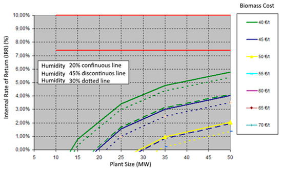 The results are represented graphically, since this allows for an easy and orderly visualization of the multitude of data analyzed (more than 1200 simulations have been carried out taking into account the variation of all the parameters studied) [6]. The profitability obtained can thus be appreciated intuitively. The graphs that represent the IRR indicate the value assured by RD 413/2014 (7.398%) as the minimum objective value, as well as the minimum value required from the business point of view (10%). The cost of the biomass represented in the graphs corresponds to the collection humidity (green t), to homogenize the data. Figure 1 shows a result of the simulation on average.