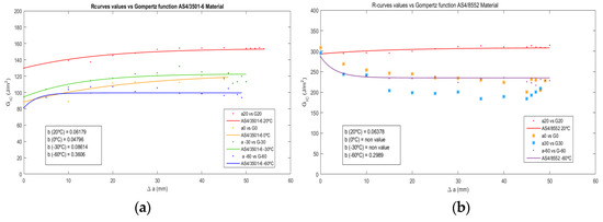 R-curves approximation by the Gompertz function for: (a) AS4/3501-6 and (b) AS4/8552 material.