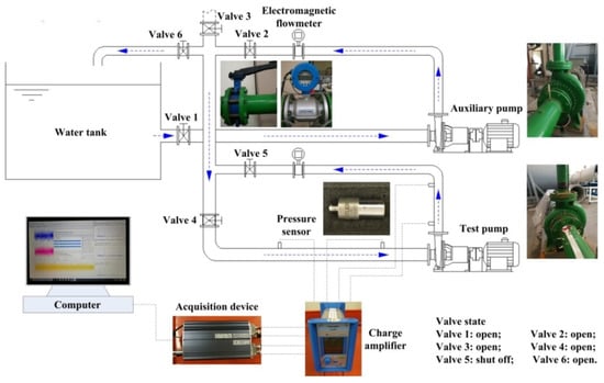 Centrifugal pumps, which are widely used to transfer liquids in a large variety of fields, are usually simple machines consisting in a bladed rotor (impeller) inside a static volute casing with inlet and outlet ports. However, the internal flow pattern is very complex since it is fully three-dimensional unsteady and turbulent flow, with regions of flow separation, recirculation and swirl []. While this precludes the analytical determination of fluid-dynamic variables of centrifugal pumps, the prediction of the internal fluid-dynamic noise is even more difficult and the estimations are little reliable. Therefore, investigation of the acoustic properties of centrifugal pumps requires the support of experimental data. Besides, the excitation of fluid-dynamic noise inside pumps represents a primary sound source for the hydraulic system formed by the external piping []. However, the pressure pulsations measured at a single position in the pipeline do not directly reflect the acoustic behavior of the pump itself, due to the coupling effects of the hydraulic circuit.
