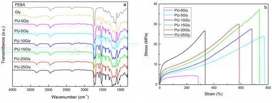 (a) FTIR spectra of Gly, PEBA and synthesized thermoplastic polyurethanes, and (b) tensile stress-strain curves of synthesized thermoplastic polyurethanes.