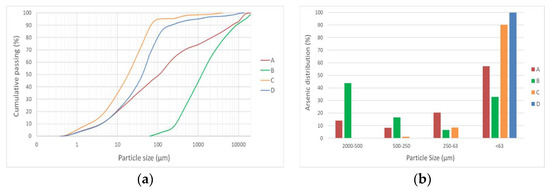 (a) Particle-size distribution of samples obtained by compositing wet-sieving and laser dispersion data; (b) Arsenic distribution along granulometric fractions in percentage.