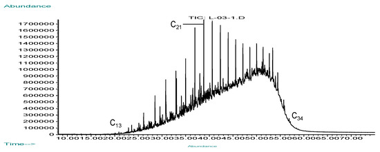 The chromatograms obtained corresponds with an oil-related mixture (naphta) partially degraded, without volatiles and with high presence of alkanes (maximum abundance in 21), aromatic compounds and sulfur heteroatomics. C18/Pr index is slightly lower than 1 (0.91), which suggest a degradation process neither long nor intense (Figure 2, sample F). Nevertheless sample E although revealed the same product (naphta), showed a C18/Pr index considerably lower (0.54), which may be a sign of higher degradation.