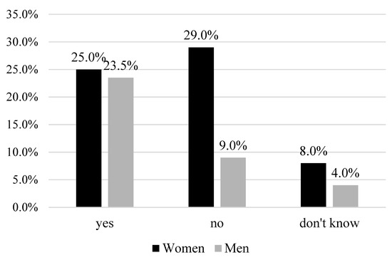 National economies have seen in recent decades a growing trend in women’s entrepreneurship (see also: [16] (pp. 204–214). Similar tendencies are observed in Poland: 29% of women do not consider starting a business and this attitude differs significantly in comparison with men. Similarly, twice as many women remain undecided about their plans in this regard (Figure 1).
