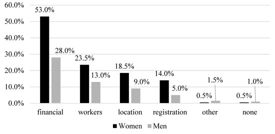 Barriers to setting up their own business according to women and men [%]. Source: Own research.