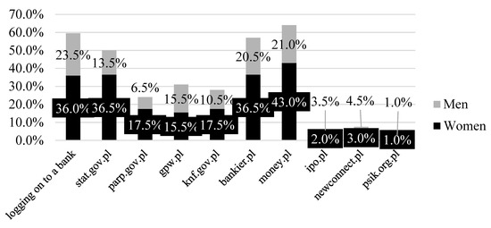 The decision to set up and run an enterprise requires the adequate knowledge. Due to the fact that the surveyed women and men indicated the financial barrier, the authors decided to check whether, and to what extent, they are familiar with the major websites containing relevant information on access to the money and capital markets. Generally, women sought information about the possibilities of financing their enterprises two, or even three, times more often than men (Figure 3).