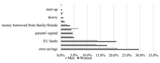 As regards the sources of financing of newly established enterprises, the main contribution in the case of both women and men were their own savings, with 29.5% of women availing of this resource (which is 8 pp more than men), EU funds (21% of women and 14% of men). (Figure 4). Venture capital and start-up financing play an even smaller role in the creation of enterprises, (see also: [20] (pp. 91–122. The literature on the subject points out that the supply of bank loans for women running a business discriminates them on the grounds of sex, price and ethnic [12]—women are extended loans on worse conditions: they are given higher interest rates and are asked to present higher guarantees [10] (pp. 151–174), [13,15]; [14] (pp. 2968–2984). Women also have hampered access—for various reasons—to other sources of funding [21] (pp. 503–521).