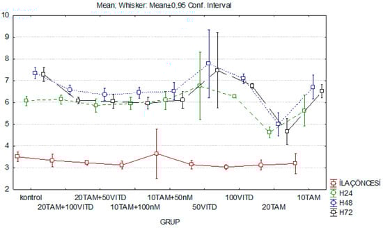 1. Findings of Combination Analysis in Tamoxifen + Vitamin D: Concentrations after 48 h 20 µM TAM (p <0.001) continued to decrease cell proliferation. The increase in cell proliferation with 50 nM and 100 nM vit D (p = 0.429, p = 0.881 respectively) and decrease in cell proliferation with 10 µM TAM (p = 0.092)) were not statistically significant. For 20 µM TAM + 100 nM vit D (p = 0,01), 20 µM TAM + 50 nM vit D (p = 0,001), 10 µM TAM + 100 nM vit D (p = 0,002) and 10 µM TAM + 50 nM Vit D (p = 0,005) combinations, cell proliferation were significantly decreased. After 72 h of cytotoxicity experiment, (20 µM TAM + 100 nM vit D (p < 0,001), 20 µM TAM + 50 nM vit D (p < 0.001), 10 µM TAM + 100 nM vit D (p < 0.001), 10 µM TAM + 50 nM vit D (p < 0.001)) cell proliferation rate were decreased. Moreover,20 µM TAM (p < 0.001) and 10 µM TAM (p = 0.033) administration also decreased cell proliferation (Figure 1).