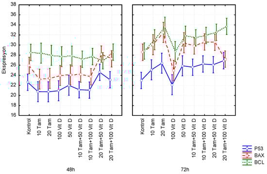 3. The Effect of Tamoxifen and Vitamin D on p53, Bcl-2 and Bax Gene Expressions: Statistically significant differences in fold change of the mRNA expression levels of Bax, Bcl-2, p53 in MCF-7 cells as compared with the untreated cells by real-time PCR is shown (p < 0.05) (Figure 2). 48 h after the combination application, p53 gene expression levels were decreased in 10 μM and 20 μM TAM, 50 nM Vit D, compared to the control group, whereas their expression increased to 72 h. However, the change in the expression of the combination groups at 72 h was higher than in the other groups. At the 48th hour, Bcl-2 expression of all combination groups increased compared to the control group. At the 72nd hour, the expression level in the 20 μM TAM +100 nM vit D group increased significantly compared to the 48th hour. After 48 h, the expression of Bax in 20 μM TAM+ 50 vit D, 20 μM TAM+ 100 nM vit D groups were found to be increased. After 72 h, Bax expression was increased in all combination groups, while it was decreased in 20 μM TAM+ 100 nM vit D group (Figure 2).
