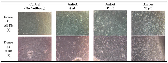 | Blood Group of Donor | Control (No Antibody) | Anti-A 6 μL | Anti-A 12 μL | Anti-A 24 μL | |