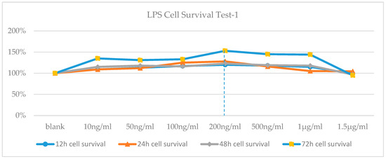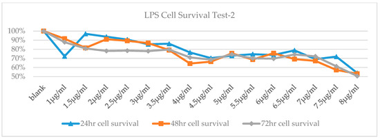 According to the results of cell survival rate, cells treated with 200 ng/mL LPS were showed the most increase in proliferation (Figure 1). The MTT test was repeated with LPS treatment at higher concentrations since no toxicity was observed after the first trial. According to the cell survival rates, LD50 dose of LPS was determined 8 mg/mL at 72th hour (Figure 2).