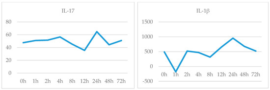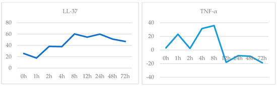It was observed that the release of the antimicrobial peptide, LL-37, started at 1.5th hour and reached its peak at the 8th hour, and it started to decrease after 24th hour. Likewise, TNF-α release started to increase at 3th hour, between 4th–8th hours had a partial plateau (which showed an increase of 25% at the 8th hour) and then decrease quickly (Figure 3). It was observed that there was no significant change in IL-17 release until 24th hour, there was an increase in 24th hour (48%) and immediately decreased. It was observed that IL-1β release started to increase in 12th hour, increased by 50% at 24th hour and returned to baseline at 72th hour. (Figure 4).