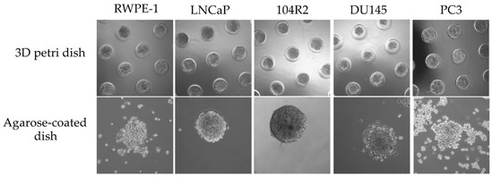 We tested five different prostate cells (RWPE-1, normal prostate epithelial cell line, LNCaP, DU145, and PC3 metastatic prostate cancer cell lines, LNCaP 104R2, LNCaP-derived castration-resistant cell line) to see if they are compatible with spheroid formation in our conditions. 24 h after the incubation of cells in 3D Petri Dishes, the spheroids were analyzed by phase contrast microscope. We confirmed that all cell lines used in this study assembled in wells properly (Figure 1).