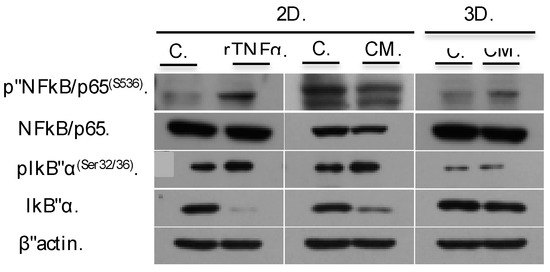 Any morphological changes based on the size of spheroids were not observed in CM-treated cells when compared to the untreated group. In addition, activation of NFκB signaling pathway was validated in 3D culture in LNCaPs (Figure 2). As expected, NFκB/p65 level stayed stable whereas increased p-NFκB/p65(S536), which has been previously shown in 2D culture [4], was observed in the CM-treated group in comparison to the control group 3D culture. On the other hand, increased p-IκB-α (Ser32/36) and degraded IκB-α protein level in 2D culture treatments remained unchanged in 3D culture (Figure 2).