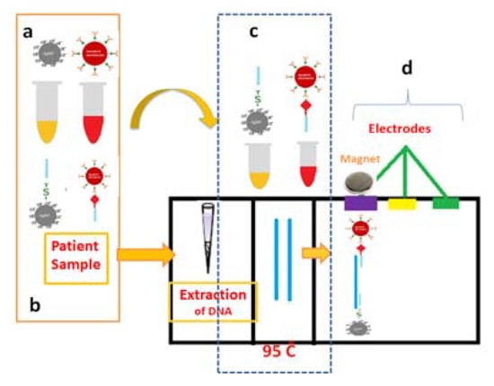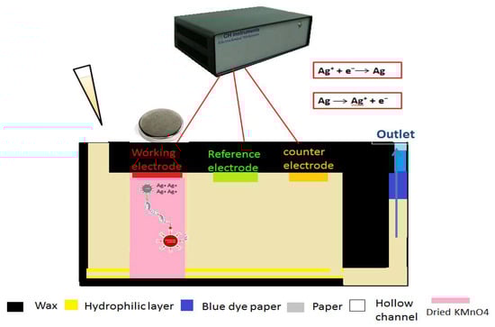 In this work, thiol and biotin labeled primers with various concentrations were modified with AgNPs and magnetic microbeads (Figure 1a,b). As seen in Figure 1c,d, oligonucleotides were first heated at 95 °C for denaturation and then cooled and annealed with primers. For accurate detection, the model analyte was finally washed by using magnet to remove remaining from environment. In order to detect lower model analyte concentrations, the hybridization of DNA with reagent labeled primers were modified with 200 μL 100 μM AgNPs-primer and 530 fM of HPV model analyte was measured. As seen in Figure 2, involving electrochemical detection method, the hybridized analyte is detected on the surface of working electrode with the help of a magnet. Firstly, the buffer containing model analyte added to the inlet is concentrated at the working electrode. After saturation of the sink, a moveable piece of paper, containing dried KMnO4−, is sent through the working electrode. The dissolved MnO4− oxidizes AgNPs to Ag+ ions. After that, negative potential is applied for 200 s to electrodeposit Ag+. Finally, the potential is swept from negative to positive potential and a change in current is measured as a result of oxidation.