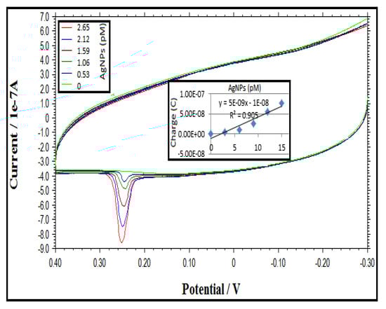 AgNPs labels and magnetic beads (Mag-Bead) were modified with real patient samples to provide analytical detection. Streptavidin-coated magnetic microbeads and Citrate-capped AgNPs, obtained from Bangs Laboratories (Fishers, IN, USA) and Ted Pella (Redding, CA, USA) respectively, were modified with biotinylated DNA based on protocol by Alivisatos and co-workers []. AgNPs and Mag-Bead modifications were also carried out with S-DNA-Bio for confirmation and they were confirmed via Agilent 8453 UV-Vis spectra (Agilent Technologies, Santa Clara, CA, USA). A potentiostat (700E, CH Instruments, Austin, TX, USA) was used to investigate and optimize electrochemical detection of the hybridized analyte. Glassy carbon (1.0 mm diameter), Ag/AgCl (KCl = 1 M) and Pt wire were used as working electrode, reference electrode and counter electrode, respectively. In addition, phosphate buffer and borate chloride electrolyte solutions were used as a medium and KMnO4 were used as the oxidation agent.