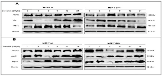 Although time-dependent curcumin (20 μM) treatment decrease cell viability loss in MCF-7 wt and GH+ breast cancer cells, autocrine GH-induced drug resistant was overcome by time dependent manner in MCF-7 cells. Curcumin resistance was observed in early drug (3–9 h) exposure in MCF-7 breast cancer cells by mitotracker/DAPI staining (data not shown). In the Figure 1, when we checked the expression profile of ER stress and autophagy key markers following curcumin exposure in MCF-7 wt and GH+ breast cancer cells, PERK expression was slightly upregulated after 9 h curcumin treatment in MCF-7 wt cells but significant upregulation was observed after 6 h in MCF-7 GH+ breast cancer cells. Although BIP expression was increased following 6 h curcumin exposure in MCF-7 wt cells, this sharp effect was not determined in autocrine GH expressing MCF-7 cells as compared to wt MCF-7 cells. In addition, prolonged curcumin exposure triggered IRE1α expressing MCF-7 wt cells, but the early IRE1α response was determined in MCF-7 GH+ breast cancer cells (Figure 2A). When we investigate the time-dependent curcumin effect on autophagy essential proteins such as Beclin-1, Atg-5, Atg-12 significant upregulation was observed only after 3 h curcumin treatment in MCF-7 wt breast cancer cells. Beclin-1, Atg-5 and Atg-12 expressions were upregulated after 12 h curcumin exposure in MCF-7 GH+ breast cancer cells (Figure 2B).