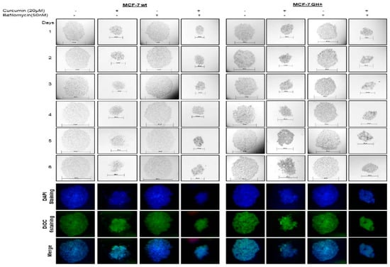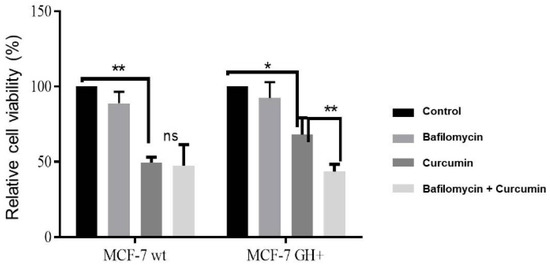 Bafilomycin increased curcumin-induced cell viability loss in MCF-7 wt and GH+ breast cancer cells.