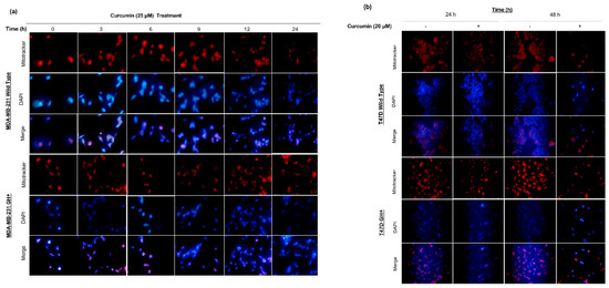 Curcumin induces cell viability loss in time dependent manner. (a) MDA-MB-231 wt and GH+; (b) T47D wt and GH+ breast cancer cells were seeded in 6 well-plate and curcumin (25 µΜ for MDA-MB-231 and 20 µM for T47D cells) exposed to cells in time-dependent (0–24 h) manner. Following drug exposure cells were stained by Mitotracker for 15 min and DAPI staining for 5 min, respectively and Mitotracker/DAPI stained cells were visualized by fluorescence microscopy.
