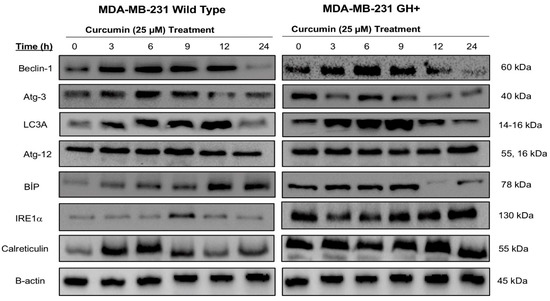 Time-dependent curcumin induced autophagy and ER stress in MDA-MB-231 and T47D wt/GH+ breast cancer cells. The time dependent effect of curcumin on autophagy key players (Beclin-1, Atg3, Atg12, LC3) and ER stress (BiP, IRE1α and Calreticulin) molecules expression profile was determined by immunoblotting.