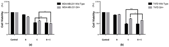 Effect of bafilomycin on curcumin-induced cell viability loss. Determined dose of curcumin (25 µΜ for MDA-MB-231 and 20 µM for T47D cells) for 24 h treatment with/without Bafilomycin (50 nM) in (a) MDA-MB-231 wild type and GH+ and (b) T47D wild type and GH+ and MTT cell viability assay was performed. The columns represent mean ± S.D. of two independent experiments and at least 3 replicates. B: Bafilomycin, C: Curcumin, B + C: Bafilomycin and Curcumin.