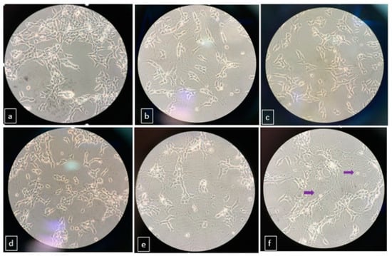 Morphology and network formation of differentiated and undifferentiated SH-SY5Y cells at different treatment periods. (a) undifferentiated (b) treated with RA for 5 days (c) treated with RA for 10 days (d) pre-treated RA for 5 days then with BDNF for 5 days (e) pre-treated with RA for 5 days then with mix medium for 5 days (f) pre-treated with RA for 5 days then with mix medium and BDNF for 5 days.