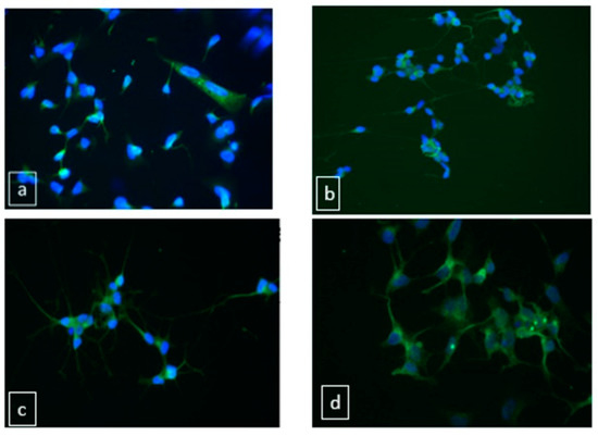 MAP-2 expression in differentiated and undifferentiated SH-SY5Y cells. (a) undifferentiated cells (b) pre-treated RA followed with BDNF (c) pre-treated RA followed with Mix medium (d) pre-treated RA followed with Mix medium and BDNF.