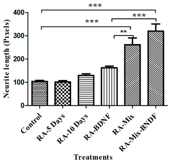 Neurite lengths of differentiated and undifferentiated SH-SY5Y cells. * Statistically significant changes (** p < 0.05 RA-BDNF vs RA-Mix, *** p < 0.001 control vs treated groups).