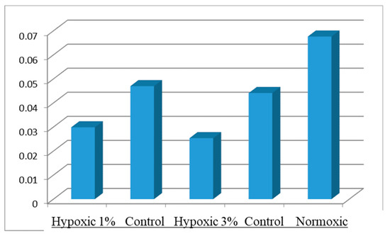 After compared of between all groups, the number of TUNEL-positive cells was higher in %1 hypoxic and this increase was statistically significant when compared with normoxic group (p = 0.0027). However, in %3 hypoxic, the number of TUNEL-positive cell was not statistically significant (p = 0.4115). It was found that the fewest TUNEL-positive cell number was in normoxic group and it was statistically significant after comparison with in 1% and 3% hypoxic groups (p = 0.0027, p = 0.0369, respectively) (Figure 4).