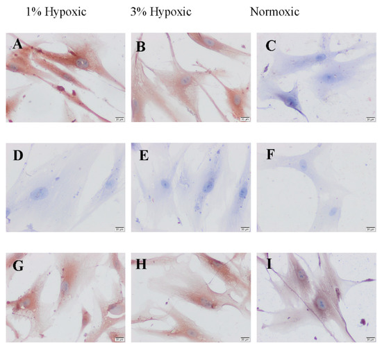 The distribution of caspase-3 (A–C), Bcl-2 (D–F) and Bax (G–I) immunreactivities of 1%, 3% hypoxic and normoxic groups of hBM-MSCs. Scale bars: 20 µm.