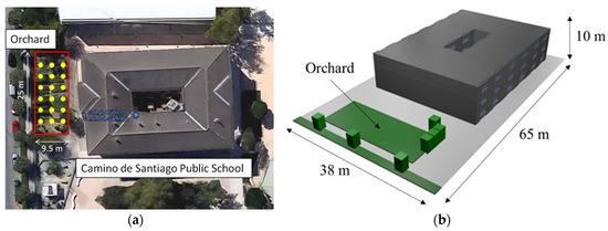 (a) ‘Camino de Santiago’ public school’s upper view; (b) View of the created scenario for the 3D Ray Launching simulations.