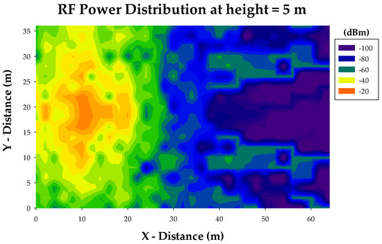 Estimated RF power distributions at height = 5 m for a wireless sensor on the orchard.