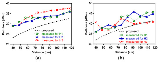 The next step was to lower the height of both transmitter and receiver simultaneously to H1 = 0.2 m and apply the same procedure of the first step. After finishing with measurements, path loss was calculated using (1), and then (6) was used to estimate the break distance db so the measured results can be compared with the proposed ones using (2) and (3).