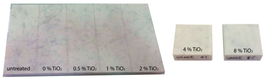 NANOESTEL was diluted to 3% with deionized water and, successively, blended with different amounts of TiO2 (from 0 w% to 8 w%). TiO2-containing coatings were applied on marble samples (Figure 1).