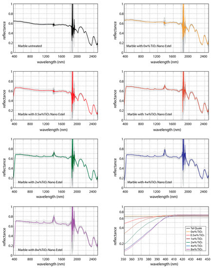 Spectral signatures obtained on marble samples covered by NANOESTEL, whit increasing weight percentage of titanium dioxide. Comparison among spectral signatures in the range 350–450 nm are shown in the bottom right panel. These measures were collected on 15 June 2016.