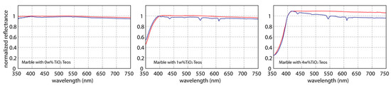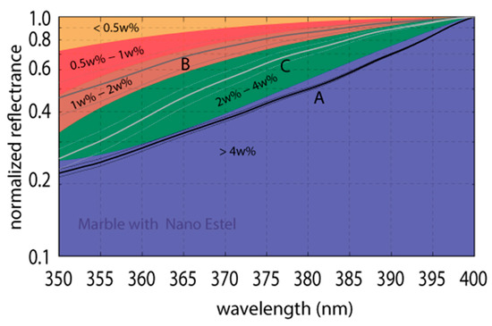 The Figure 2 shows the spectral signatures obtained by marble samples superficially covered by NANOESTEL coating, varying the TiO2 weight percentage. These measures are those collected on 15 June 2016. Note that the appreciable difference among the reflectance values are shown in the ultraviolet range (350–400 nm) of the electromagnetic spectrum, especially. This behavior is strongly linked to the presence of titanium dioxide: in fact, its spectral signature available in the ASTER spectral library [6] allows to find very high slope already in the wavelength range from 400 nm to 410 nm, with a strong decrease of reflectance moving towards the ultraviolet range.