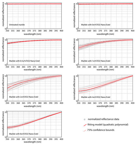 Based on normalized reflectance data, in Figure 4 the fitting curves are reported for each TiO2w% analyzed. In the same figure, also, the 75th percentile confidence bounds are indicate in order to assess the statistical reliability of the models. The coefficients obtained by regression of data and RMSE (Root Mean Square Error) for assessing goodness of fits are reported in Table 1.