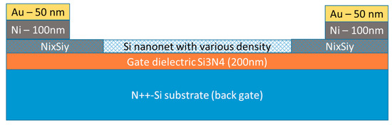 After the transfer, the nanonet conductivity is enhanced through sintering to create conducting paths at NW/NW junctions [9]. With this aim, rapid thermal annealing was carried out on the nanonets under nitrogen at 400 °C for 1 min. The source and drain contacts are defined by photolithography and lift-off of a stack consisting of 100-nm-thick nickel and 50-nm-thick gold. Good contact between the semiconductor and electrodes is achieved through the silicidation performed at 400 °C for 1 min.