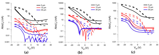 We plot the drain current-gate voltage curves for low, medium and high-density Si nanonet FETs in Figure 3 at a drain voltage of Vds = −4 V. Each subfigure shows the curves for two consecutive gate voltage up-down sweeps for FETs with 5 µm, 15 µm and 30 µm channel, where channel gap is defined as the distance between source and drain contacts. Up sweeps are shown in solid lines and down sweeps are shown in dashed lines. Comparing the three subfigures, we found that the drain current for high density nanonet FETs (10.4 × 107 SiNWs/cm2) is similar to that for medium density nanonet FETs (8.2 × 107 SiNWs/cm2) and that both are significantly higher than that for low density nanonet FETs (5.9 × 107 SiNWs/cm2). We conclude that higher density nanonets have lower channel resistance than low density nanonets due to the formation of more conducting paths linking the source and the drain.