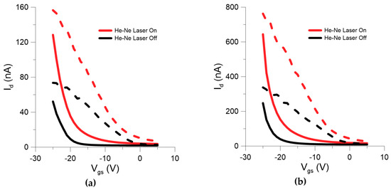 We used a continuous wave He-Ne laser (power <1 mW, wavelength 632 nm) to irradiate the high density, 5 µm long nanonet channel FETs and measured the drain current while the gate voltage was swept up and down. In Figure 4, we compare the drain current-gate voltage curves when the laser was turned on and off at drain voltages of Vds = 1 V and Vds = 5 V. Up sweeps are shown in solid lines and down sweeps are shown in dashed lines. We found that laser irradiation almost doubled the drain current throughout the operation range. For example, during gate voltage up sweeps maximum drain current (at Vgs = −25 V) increased from Id = 52 nA to 128 nA for Vds = 1 V and from Id = 323 nA to 643 nA for Vds = 5 V. Similarly, during gate voltage down sweeps drain current (at Vgs = −25 V) increased from Id = 73 nA to 156 nA for Vds = 1 V and from Id = 337 nA to 762 nA for Vds = 5 V. The doubling in the drain voltage current allows us to conclude that Si nanonet FETs are viable candidates as photodiodes.