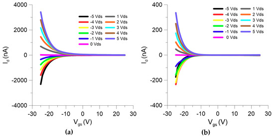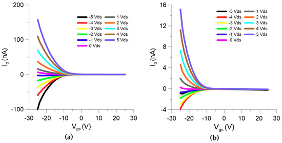 The up-sweep Id-Vgs curves for medium density 15 µm nanonet channel FETs measured in (a) March and (b) September 2017.