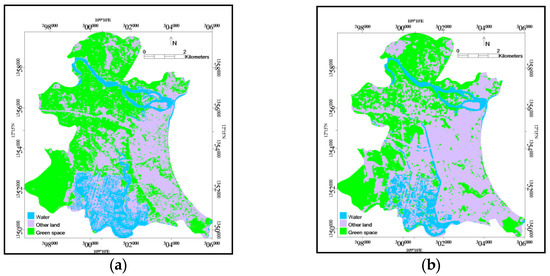 Distribution of UGS in urban core. (a) UGS in 2007; (b) UGS in 2017.