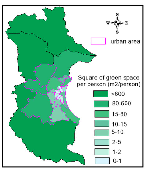 The urban green space index per capita has been used to evaluate environment quality and urban space all over the world [8,9]. Based on the population statistics of research area, in the urbanization area with many residences being built, the new urban areas show positive result with the urban green space index per capita over 100 m2/capita. However, in the inner-city area, most of the urban green space index per capita are low, under 10 m2/capita (apart from Ward Loc Tho). Especially, in Ward Van Thanh, Phuong Sai, Phuoc Tien, the green space index per capita is under 1 m2/capita (Figure 3). The results above showed that these inner-city areas are severely short of urban green space, based on TCXDVN 9257:2012. Thus, the green space index per capita in the inner-city areas of Nha Trang city is much lower than that of mentioned cities. These areas are even in severe shortage of green space compared with the equivalent areas of Ho Chi Minh City and Hanoi.