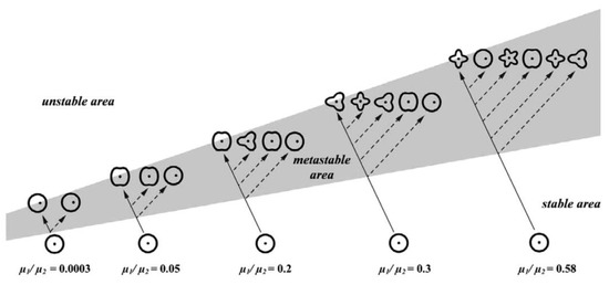 The possible sequence of structures during the displacement in the Hele-Shaw cell at different viscosity ratios µ1/µ2 [6].