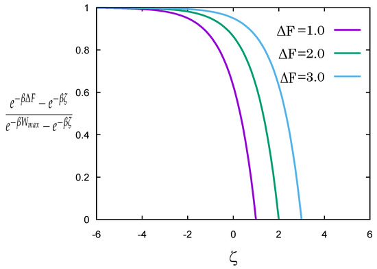 Note that contrary to the equality Equation (4), the right hand side of the above contains the information of the position of . In addition, the value of the minimum work is irrelevant, because it does not appear in the bound. We show in Figure 1 that the lower bound lines are decreasing functions of for a fixed maximum work value. We observe that the bound lines move rightward as increases and the value of bounds approach unity as the threshold value gets smaller, which is intuitively consistent. The bound value vanishes when equals to the free energy difference. Just to be certain, we stress that the bound Equation (6) is relevant only for and it is simply replaced by for a range .