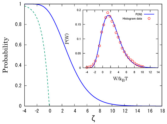 The plot data in the inset shows the work distribution constructed from the measured histogram by the experiment of Ref. [7] and the solid line shows the nonlinear least-squares fit to the gamma distribution Equation (8). The solid blue line indicates the probability represented by the lower incomplete gamma function Equation (9). The dashed line indicates the lower bound by Equation (6). The values and are used for the calculations of the bound line.